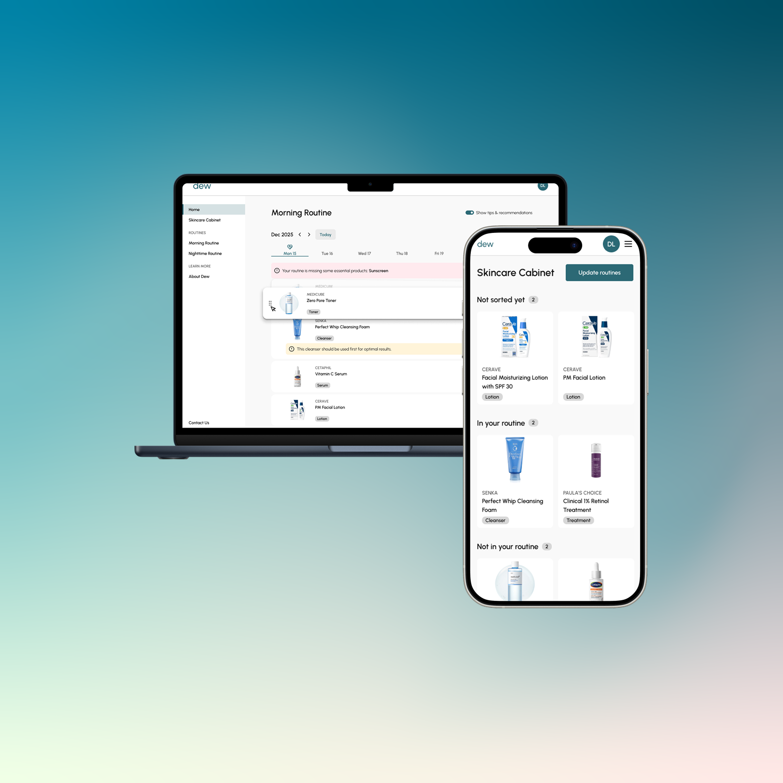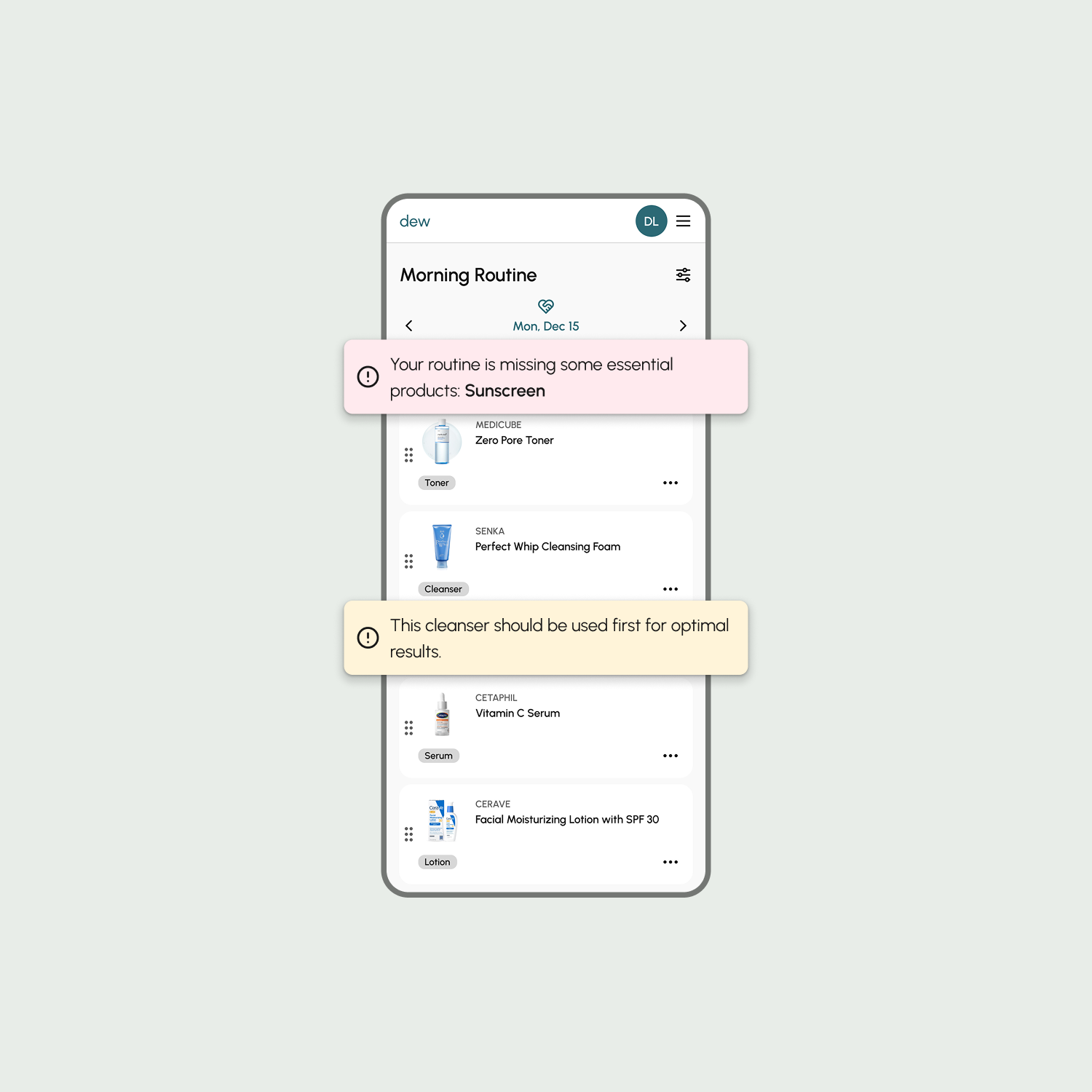 Dew automatically flags potential issues in your routine — like products that shouldn’t be layered together, steps that are out of order, or key products that might be missing.